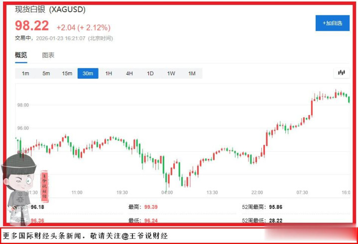 更刺激的是,被称为“黄金影子”的白银,直接杀红了眼,现货白银价格一度冲破99美元/盎司,单月涨幅飙到38%,距离三位数的百元大关仅一步之遥!