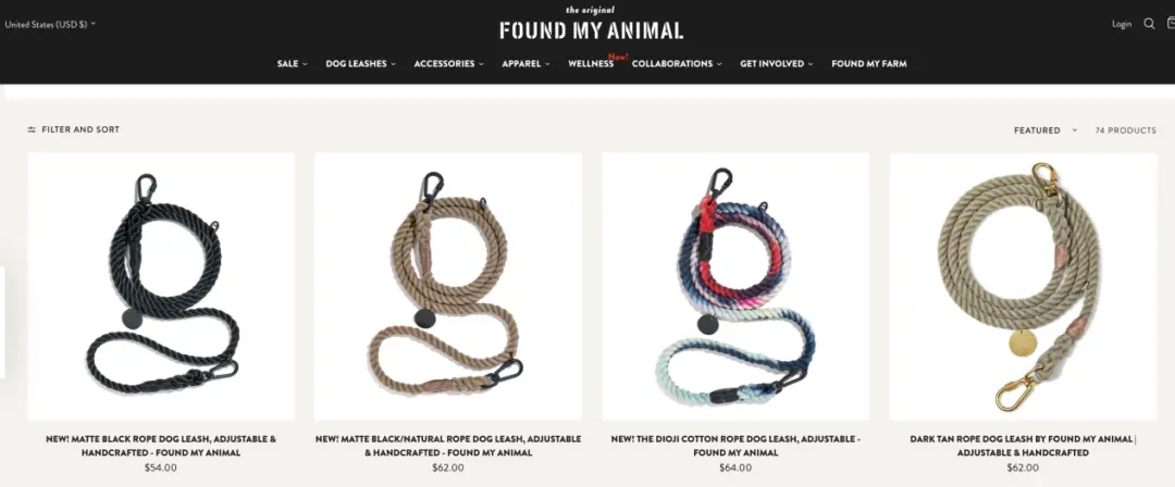 Found My Animal的产品线包括绳结项圈、牵引绳、背心、宠物床和时尚配饰,定价在40-80美元(约280-560元人民币)金多多策略,定位中高端,兼具亲民性与品质感。