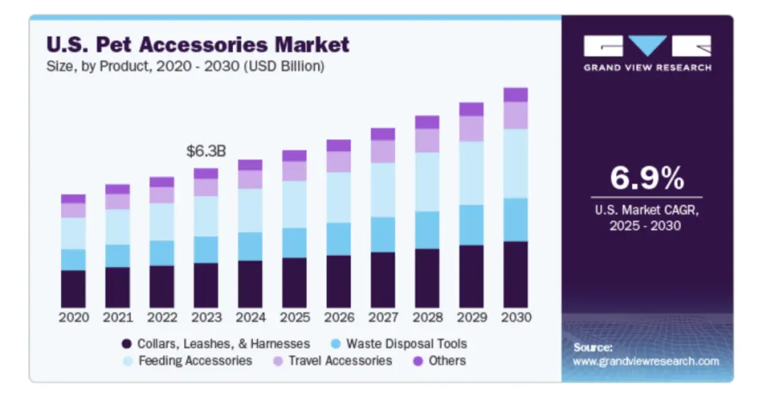 2023年,全球宠物配饰市场规模约30亿美元,预计到2030年将增长至40-50亿美元,年复合增长率约为6%。